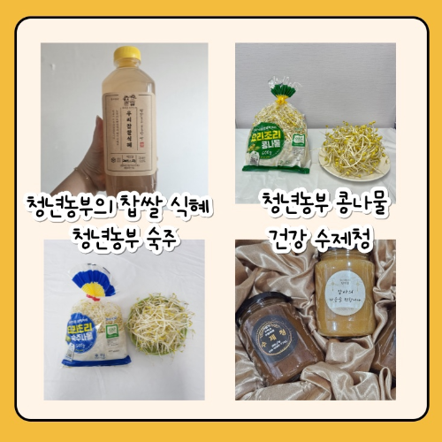 이번 체험전의 매력 포인트 중 하나는 청년 농부들이 직접 재배, 생산한 지역 특산물을 만날 수 있다는 점입니다. 행사용 이미지에 등장하는 콩나물, 찹쌀 식혜, 숙주, 그리고 건강 수제청은 모두 청년농부의 손길이 담긴 신선하고 믿을 수 있는 제품들입니다.