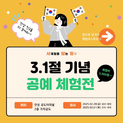 위 이미지는 다가오는 3.1절을 기념하여 안성 공동터미널 2층 ‘가치공도’에서 열리는 공예 체험전 홍보 포스터와 체험 프로그램 소개 자료입니다. 포스터에는 전통 한복을 입은 일러스트 소녀가 태극기를 들고 있는 모습이 담겨 있으며, 일러스트 옆에는 “안성 친구들 다 모여라~!” 라는 말풍선이 함께 표현되어 있습니다.
