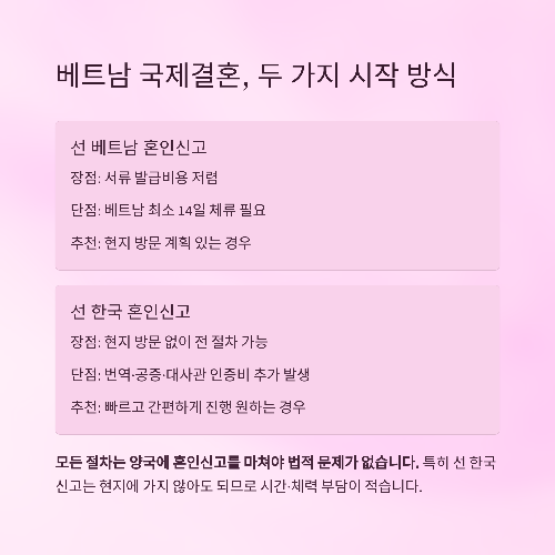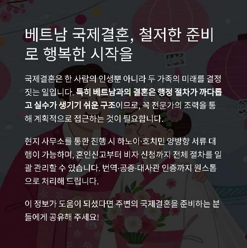 특히 베트남과의 결혼은 행정 절차가 까다롭고 실수가 생기기 쉬운 구조이므로,