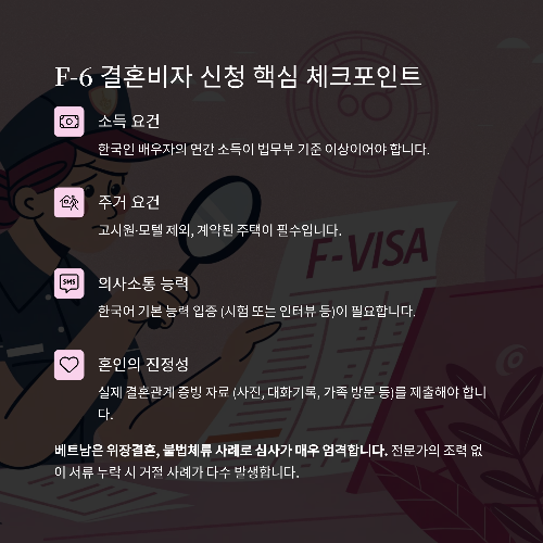| 소득 요건 | 한국인 배우자의 연간 소득이 법무부 기준 이상 |
