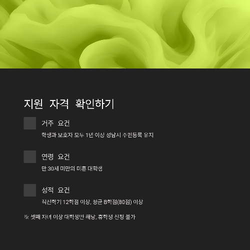 | 거주 요건 | 공고일(2025.5.1.) 기준 학생과 보호자 모두 1년 이상 성남시 주민등록 유지 |