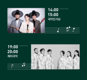 낮 2시에는 ‘국악인가요’, 저녁 7시에는 ‘제이국악’이 참여해 전통과 현대를 접목한 퓨전 국악 공연을 선보입니다.