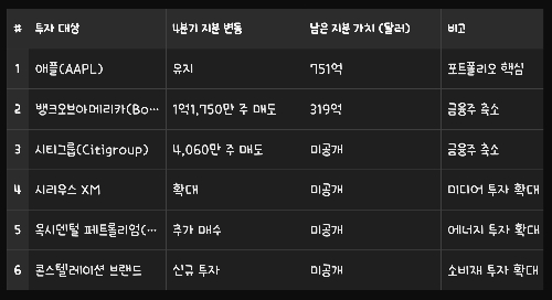 뿐만 아니라 시티그룹(Citigroup) 주식 4,060만 주를 추가 매각하며 금융권 투자 비중을 낮추는 모습을 보였다.