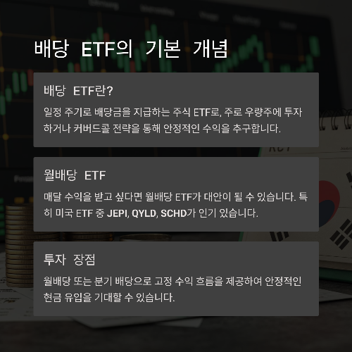 배당 ETF는 일정 주기로 배당금을 지급하는 주식 ETF입니다.