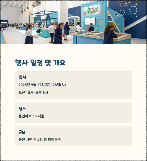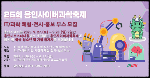 용인시가 주최하는 제25회 용인사이버과학축제가 오는 2025년 9월 27일부터 28일까지 2일간 용인미르스타디움에서 개최됩니다.