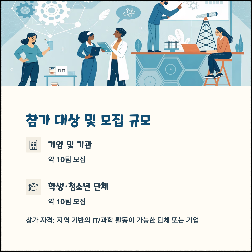 참가 자격은 지역 기반의 IT/과학 활동이 가능한 단체 또는 기업이며, 전시 부스나 체험 활동 운영이 가능한 곳에 한합니다.