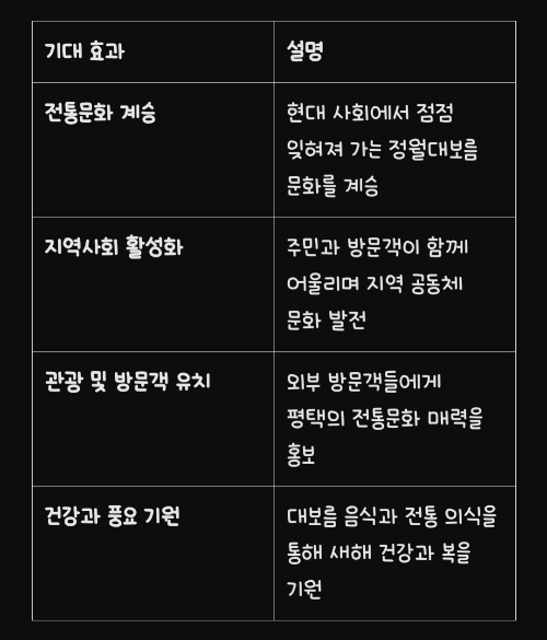 대보름을 맞아 마을 사람들이 함께 모여 전통문화를 체험하고, 서로의 안부를 묻고, 따뜻한 정을 나누는 시간이 될 것이다. 또한, 요즘처럼 바쁜 현대사회에서 잊혀져 가는 전통을 다시금 되새기며, 우리의 문화유산을 보존하는 계기가 될 것이다.