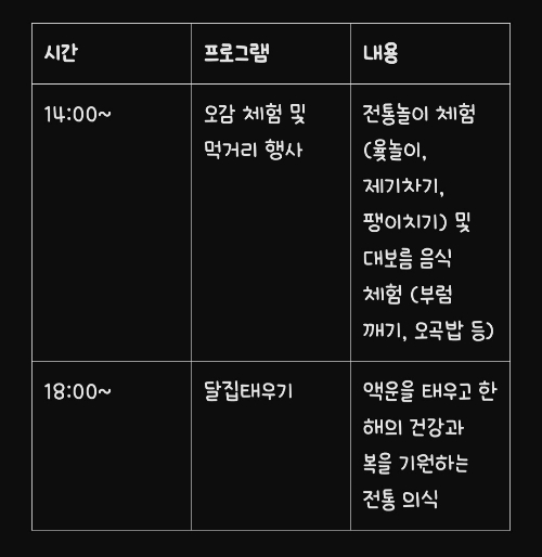 이번 행사는 전통문화 체험, 먹거리 행사, 그리고 하이라이트인 달집태우기까지 다채로운 프로그램으로 구성되어 있다.