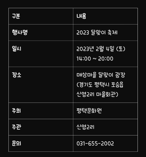 새해가 밝고, 정월대보름을 맞이하는 시점에서 우리 전통문화를 기념하는 뜻깊은 행사가 열린다. 2023년 2월 4일(토), 평택시 포승읍 신영2리 매상마을에서 '2023 달맞이 축제'가 개최된다.
