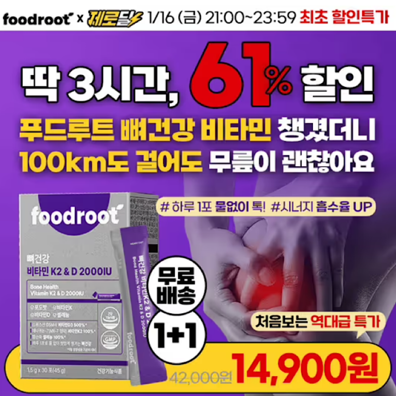 푸드루트 뼈건강 비타민 D3+K2+셀레늄 14900 1+1 구성, 3시간 특가, 스위스산 비타민 함유