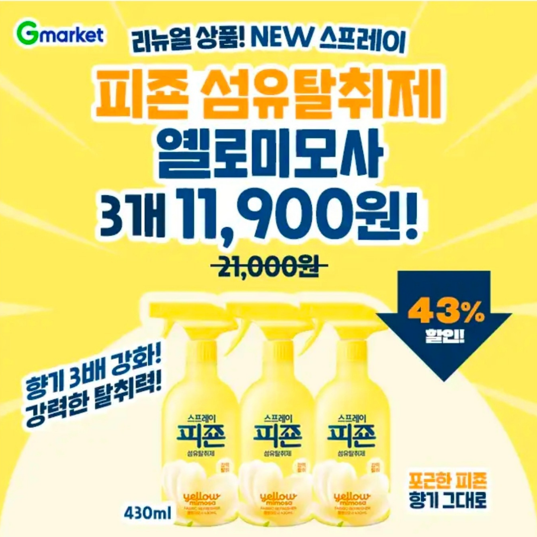 오늘만! NEW 스프레이 피죤 섬유탈취제 옐로미모사 430ml 3개