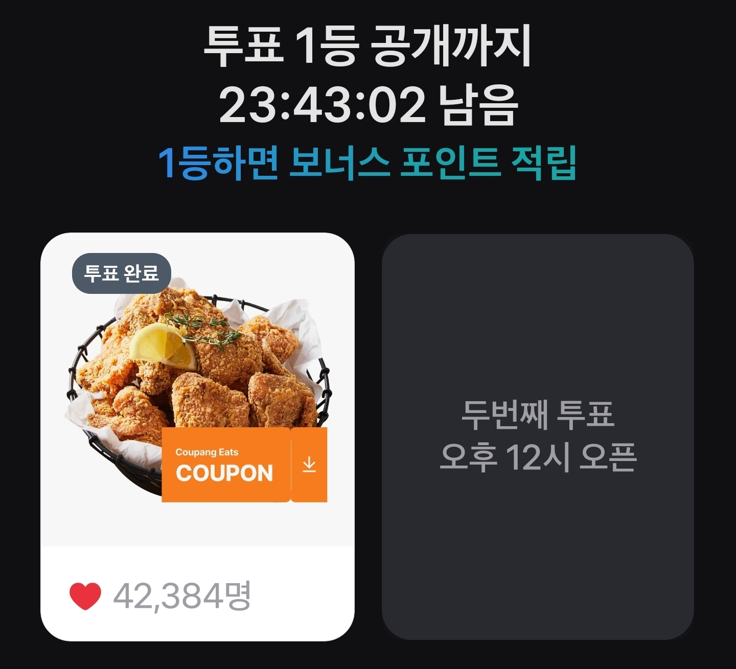 | 오후 | 재료듬뿍 피자 할인 | 실시간 투표 상위권 부상 |