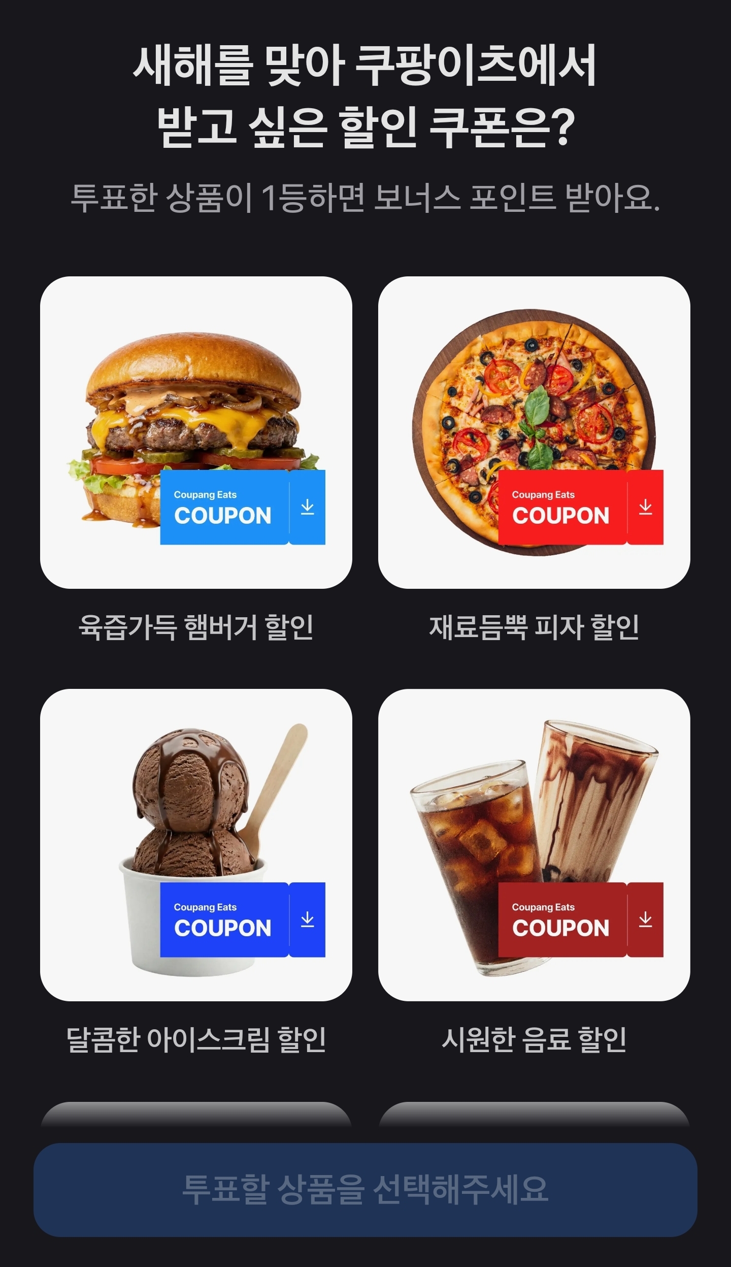 오늘의 주제는 바로 "새해를 맞아 쿠팡이츠에서 받고 싶은 할인 쿠폰은?"