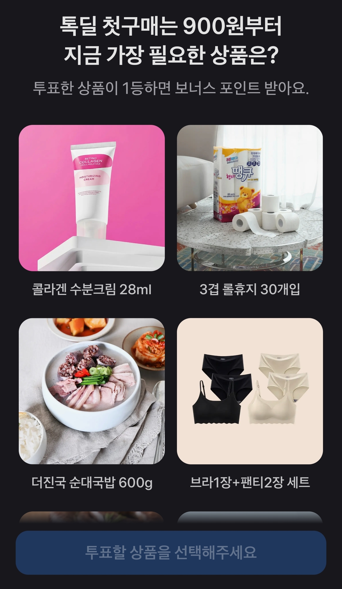 “톡딜 첫구매는 900원부터, 지금 가장 필요한 상품은?” 입니다.