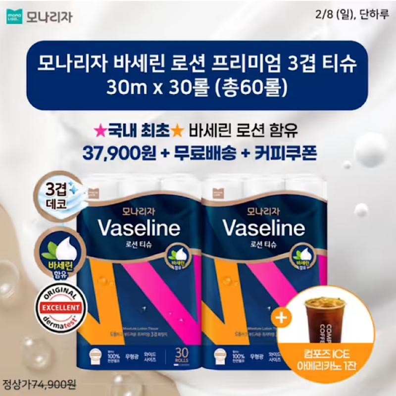 모나리자 바세린 로션 프리미엄 3겹 티슈 특가가 열렸습니다.