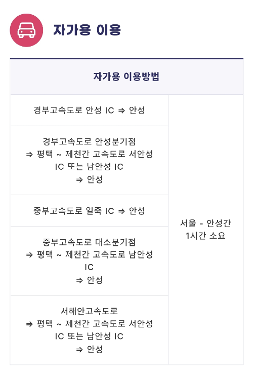 *축제장에 주차장이 준비되어 있지만 작년 축제때 생각해보면 자차로 축제 주차장을 이용하는 것보다 안성시에서 마련해주는 임시주차장에 주차를 하고 축제 셔틀버스를 이용하는 것이 축제장에 빠르게 도착해서 즐거운 시간을 보낼 수 있습니다.