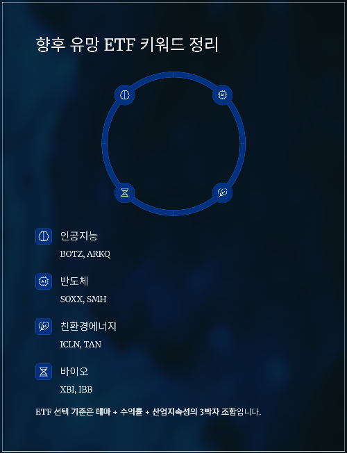 핵심: ETF 선택 기준은 테마 + 수익률 + 산업지속성의 3박자 조합입니다.