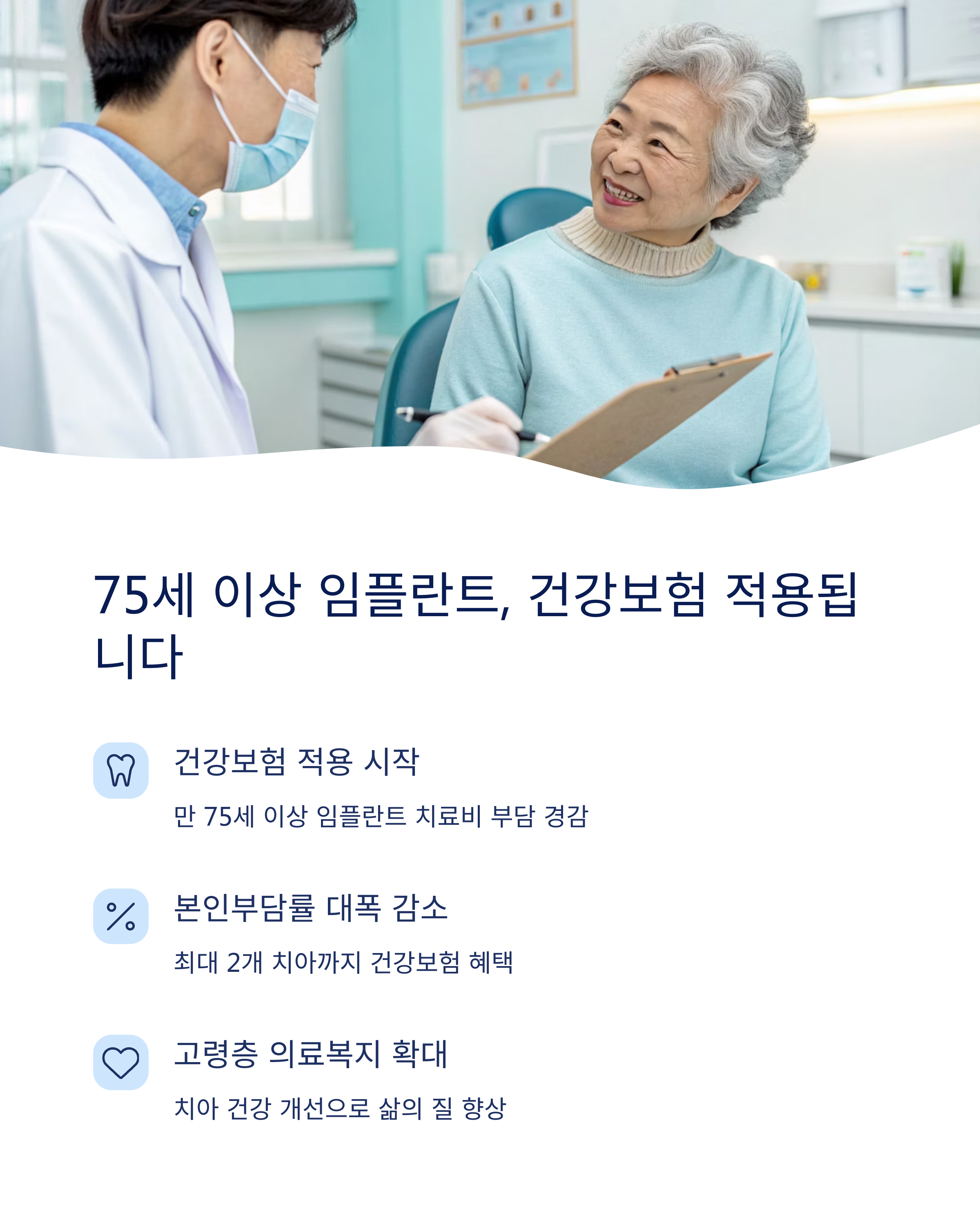 75세 이상 고령자를 대상으로 임플란트 시술 시 건강보험 혜택이 적용됩니다.