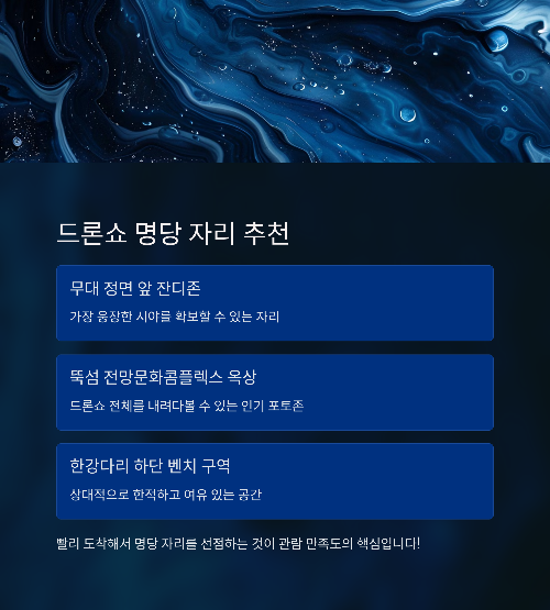 | 2025 Hangang Drone Light Show Full Guide 🌟 A Magical Moment Painting the Seoul Night Sky (0) | 2025.04.30 |