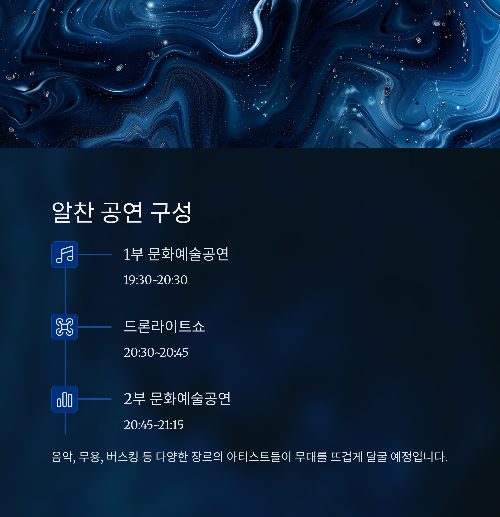 1부 문화공연 → 드론쇼 → 2부 문화공연까지 꽉 찬 구성이에요.