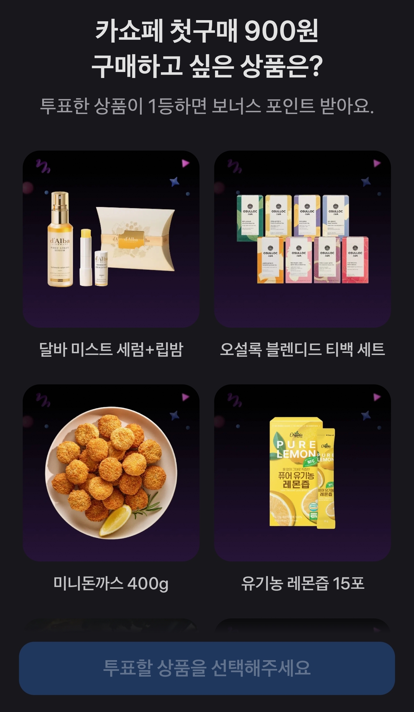오늘 주제는 카쇼페 첫구매 900원으로 구매하고 싶은 상품을 선택하는 투표입니다.