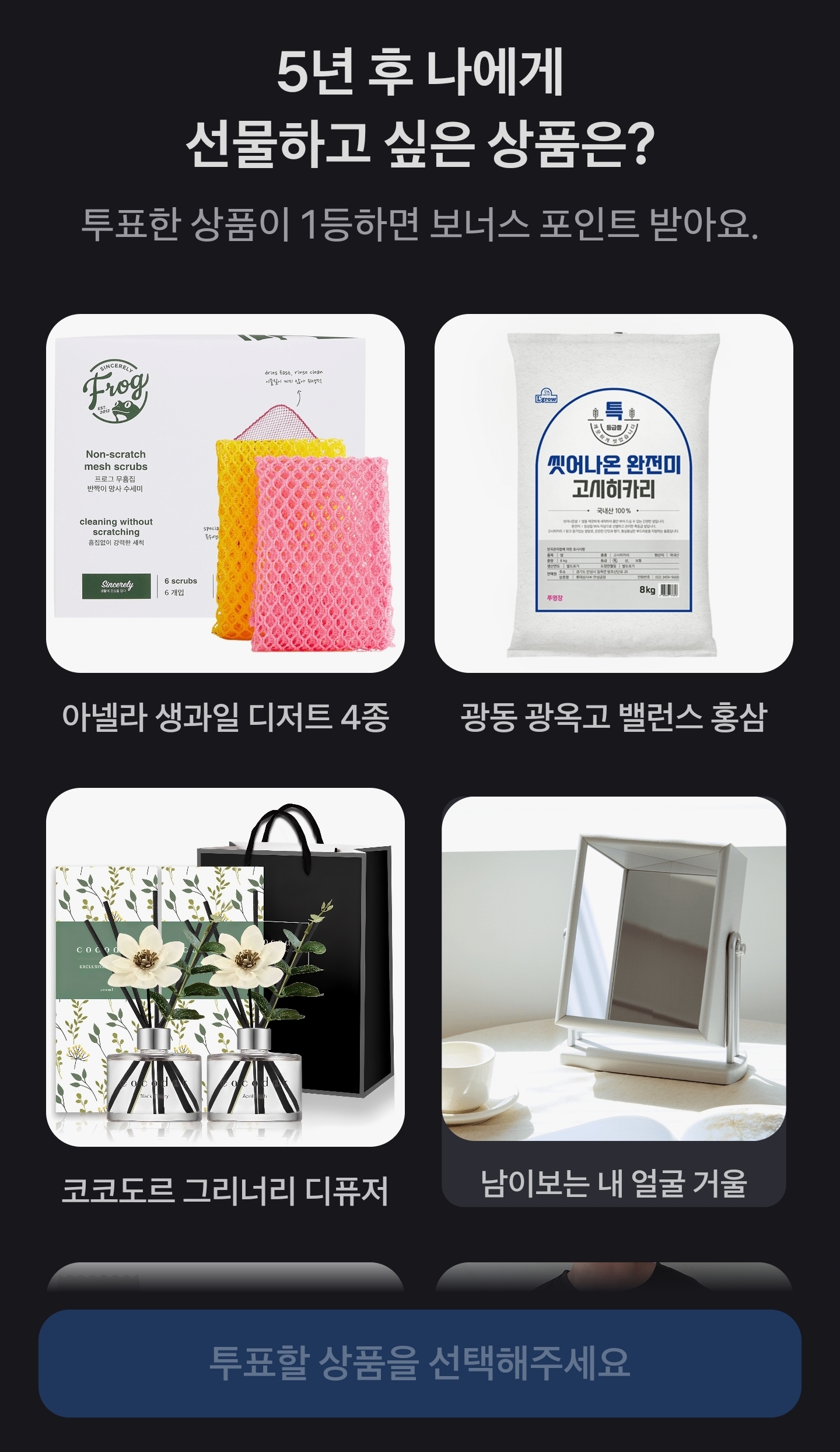 5년 뒤에도 의미 있게 사용할 제품을 선택하는 투표형 퀴즈입니다.